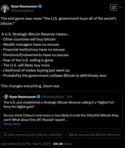 Varlık yöneticisi Bitwise’ın araştırma başkanı Ryan Rasmussen, X gönderisinde, ABD hükümetinin aktif olarak BTC satın almasa bile, “ABD Stratejik Bitcoin Rezervi şu anlama geliyor… Diğer ülkeler Bitcoin satın alacak… [ve] Finans kuruluşlarının BTC tahsislerini eklememek için hiçbir mazereti yok” dedi.
